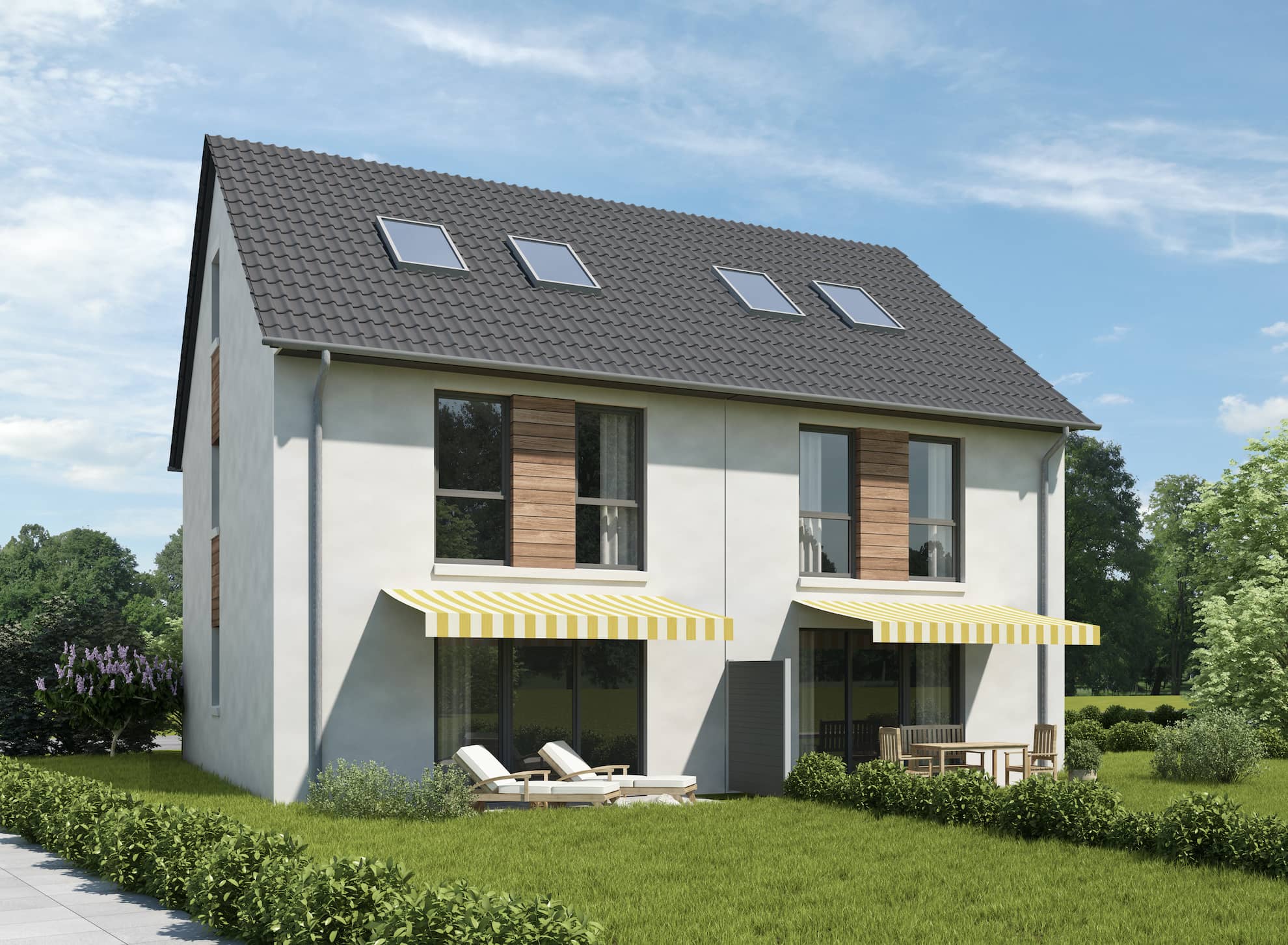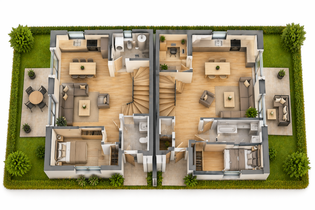 Двухквартирные дома часто имеют как личные, так и общие внешние пространства, например сад, террасу или двор.